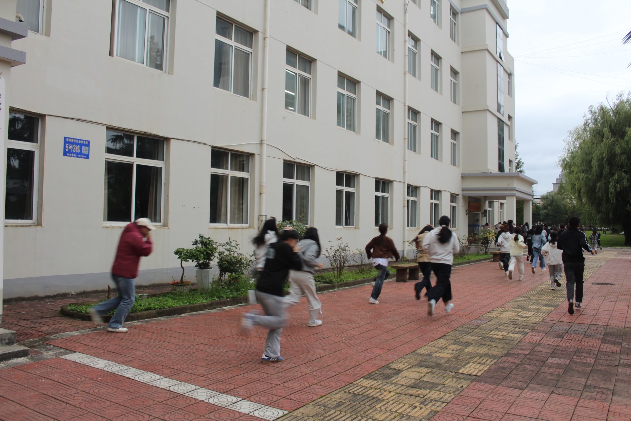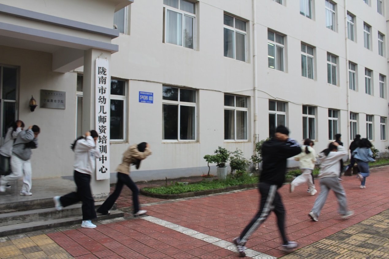 下午4时40分,演练正式开始。随着急促的消防哨声响起,学生在辅导员及安全员的引导下,迅速用湿毛巾捂住口鼻,沿预定路线低姿、快速、有序撤离。疏散过程中,体育与健康学院学生在楼梯转角、走廊岔口等关键位置协助维持秩序;学前教育学院师生模拟带领幼儿疏散的场景,展现出良好的组织协调能力。全体人员仅用3分40秒便安全抵达操场指定集结区域。