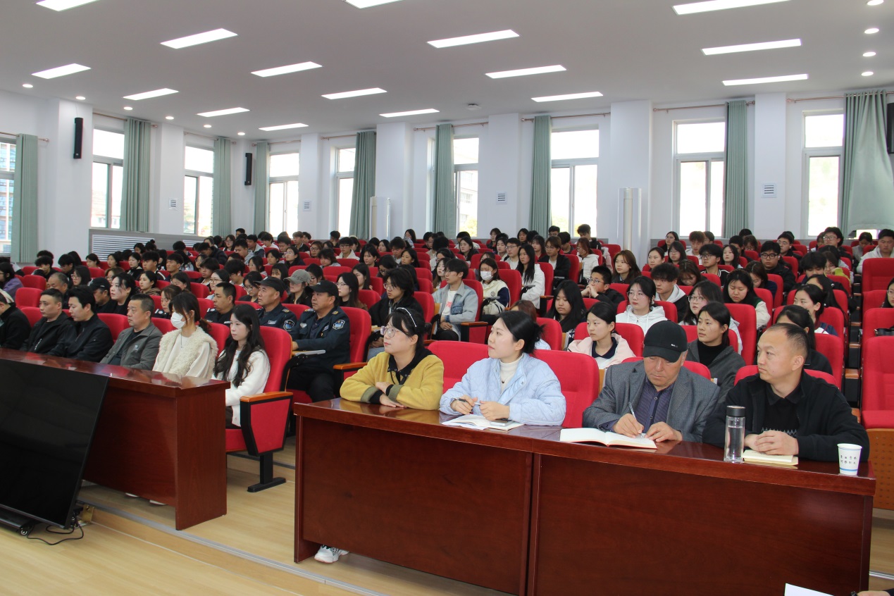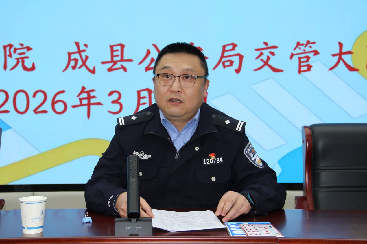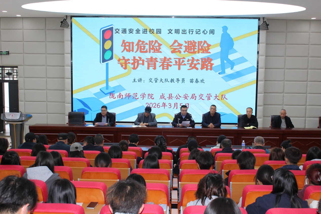 为进一步强化校园安全教育,提升全体师生交通安全防范意识与应急能力,筑牢校园安全防线,2026年3月5日,学校邀请成县公安局交管大队教导员苗春欢为学校师生进行以“知危险 会避险 守护青春平安路”为主题的交通安全知识专题宣讲活动。学校保卫处、学生处、团委负责人、学校全体安保人员、各学院辅导员、学生代表共计180余人参加本次活动。